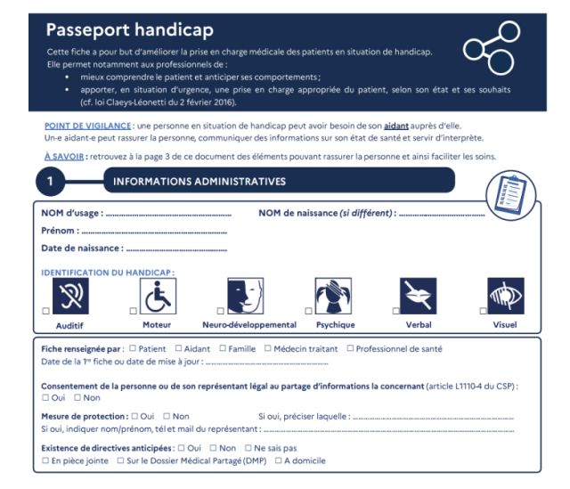 Le Passeport handicap est un document à compléter, en dehors d’un contexte d’urgence, par le médecin traitant, un professionnel, un aidant ou un proche du patient.