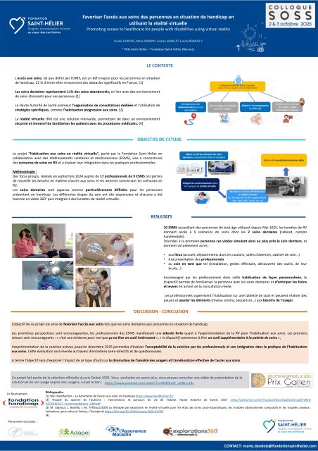 Le projet "Habituation aux soins en réalité virtuelle", porté par la Fondation Saint-Hélier en collaboration avec des établissements sanitaires et médicosociaux (ESMS), vise à coconstruire des scénarios de soins en RV et à évaluer l’intégration de ces technologies dans les pratiques professionnelles.