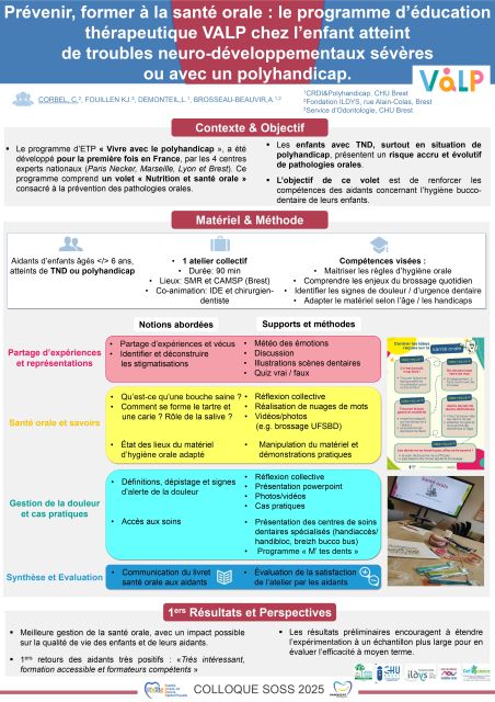 Suite à une demande exprimée par les aidants dans le cadre du programme d'éducation thérapeutique "Vivre Avec Le Polyhandicap" (VALP), un module spécifique dédié à la nutrition et à la santé orale a été co-construit avec des experts de terrain et des familles partenaires. L’objectif principal est de renforcer les compétences des aidants concernant l’hygiène bucco-dentaire de leurs enfants. L’atelier, d’une durée de 90 minutes, est co-animé par une infirmière et un chirurgien-dentiste. Il s’adresse à des groupes d’aidants, regroupés selon l’âge de leur enfant (</> 6 ans), afin de favoriser les échanges d’expérience. Le contenu repose sur des animations pédagogiques et ludiques (ex. démonstrations de brossage, mises en situation, manipulation de matériel adapté) valorisant les savoirs expérientiels des familles.