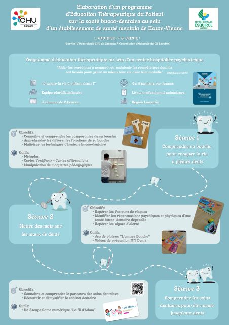 La santé mentale en tant que maladie chronique regroupe diverses pathologies qui peuvent s’accompagner chez ces patients d’une fragilité de leur santé bucco-dentaire. Dans cette approche, l’hôpital psychiatrique de Limoges, CH Esquirol, en partenariat avec le service d’odontologie du CHU de Limoges a décidé de créer un programme d’ETP sur la santé bucco-dentaire destiné aux malades psychiatriques, avec pour enjeu d’améliorer grâce à trois ateliers leurs connaissances et leur compréhension en matière de santé orale et de parcours de soins.