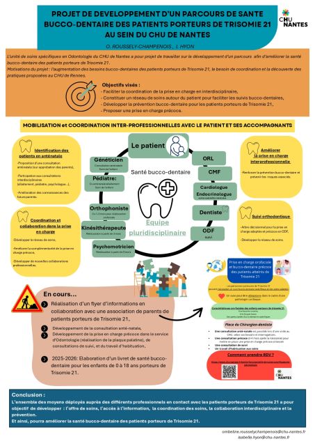 L’unité de soins spécifiques en odontologie du CHU de Nantes développe actuellement un parcours de prise en charge bucco-dentaire précoce pour les patients porteurs de Trisomie 21 en lien avec des généticiens, des pédiatres, des orthophonistes, des ORL et des orthodontistes.