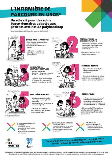Au travers d'une carte mentale, nous souhaitons mettre en lumière la connexité des activités mises en œuvre par l'infirmière de parcours des soins spécifiques en odontologie du CHU de Nantes pour permettre aux patients de vivre une prise en charge optimale et globale dans une coopération transdisciplinaire."
