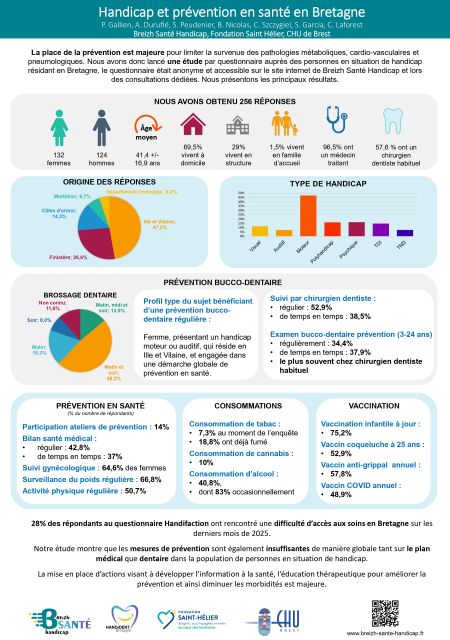 À travers cette enquête menée en Bretagne, ce poster met en lumière un paradoxe : les personnes en situation de handicap sont majoritairement suivies par des professionnels de santé, mais la prévention reste encore insuffisamment investie.