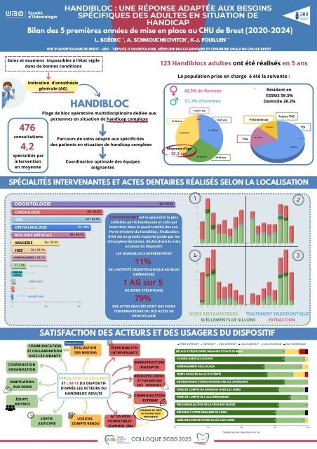 L’analyse quantitative et qualitative met en évidence une montée en charge importante du dispositif, une prédominance des actes bucco-dentaires avec l’intervention de l’odontologie dans 99,2% des Handiblocs adultes ainsi qu’un haut niveau de satisfaction exprimé par les patients, leurs aidants et les professionnels impliqués.